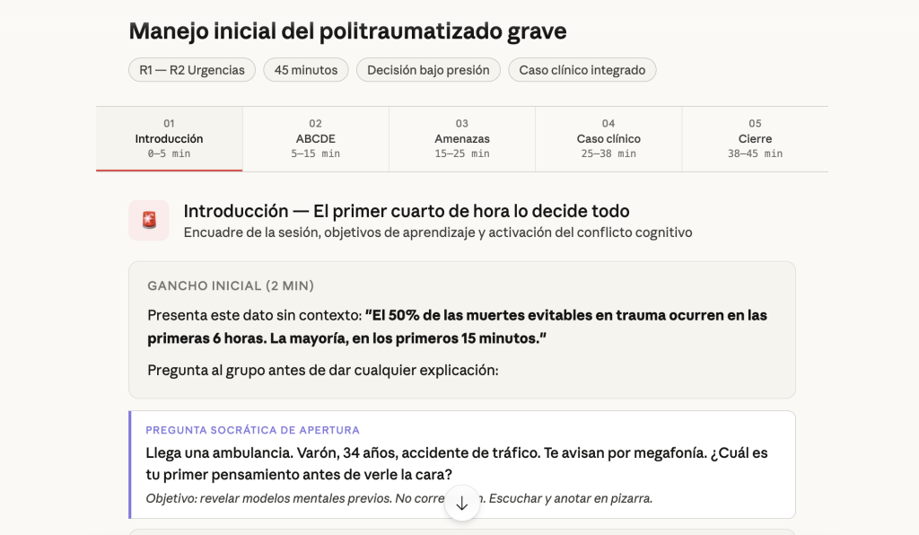 Vamos a construir una sesión real. El escenario: tienes un grupo de residentes de urgencias de R1 y R2, y quieres hacer una sesión de 45 minutos sobre el manejo inicial del politraumatizado grave.