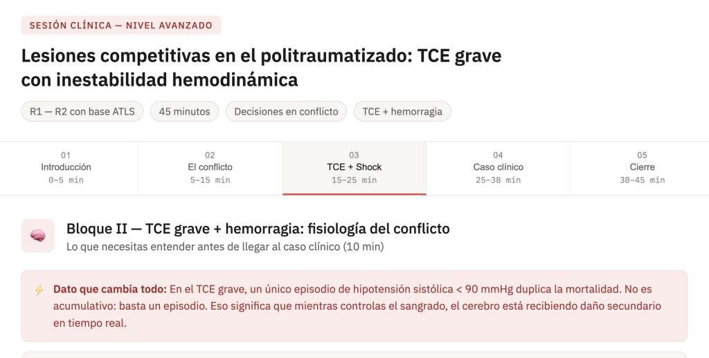 Ahora ajusta la sesión teniendo en cuenta que mis residentes ya han rotado por cirugía general y tienen buena base en ATLS. El punto débil que he detectado es la toma de decisiones en los primeros 15 minutos cuando hay lesiones competitivas: por ejemplo, TCE grave más inestabilidad hemodinámica. Quiero que el caso clínico integrado gire en torno a esa situación concreta. Añade al menos tres momentos de pregunta socrática específicamente en ese punto de decisión.